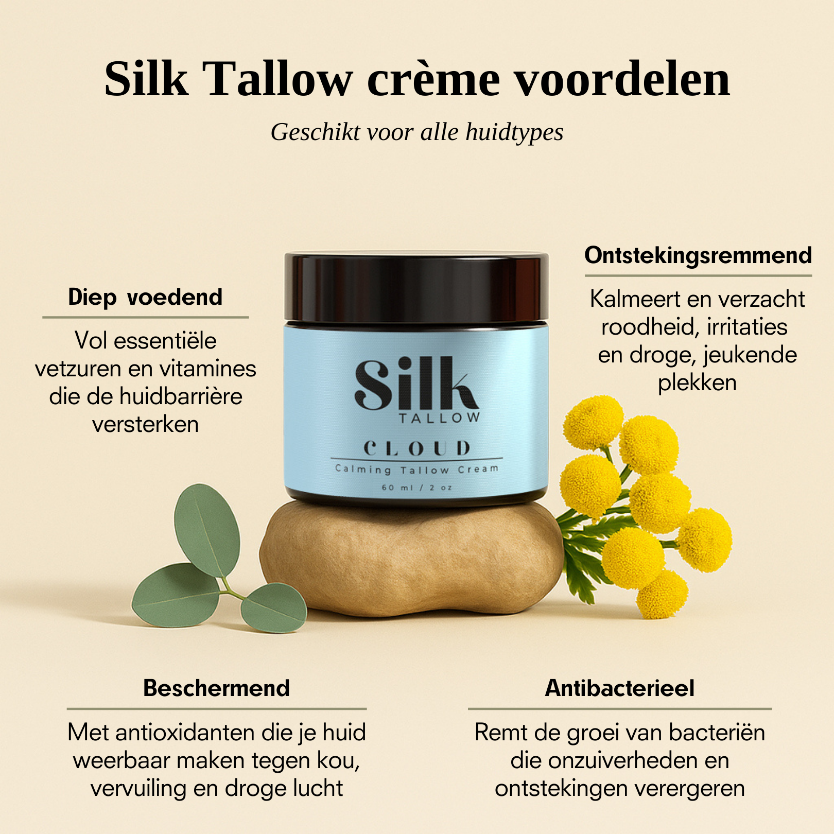 Absoluut! Dit product is ontwikkeld voor alle huidtypes, inclusief droge, vette, gevoelige en gecombineerde huid. Dankzij de natuurlijke, niet-pore-verstoppende ingrediënten zoals tallow en jojoba-olie, werkt het harmonisch samen met je huid. Zelfs als je last hebt van huidproblemen zoals acne, roodheid of eczeem, biedt dit product kalmering en hydratatie zonder irritatie te veroorzaken. Als je specifieke vragen hebt over je huidtype, helpen we je graag verder!