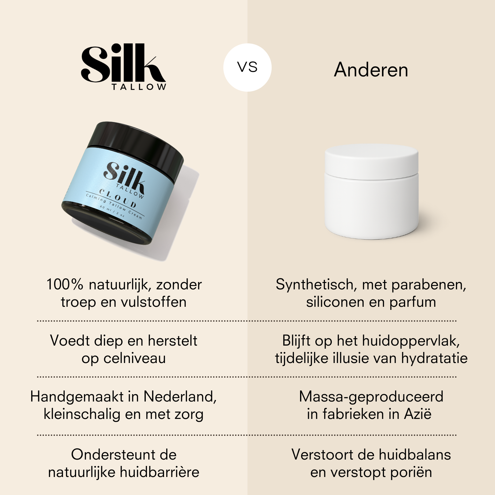 Onze producten worden gemaakt met hoogwaardige, volledig natuurlijke ingrediënten zoals tallow en jojoba-olie. Tallow voedt je huid diep en houdt vocht vast, zodat deze zacht en soepel blijft. Jojoba-olie brengt de natuurlijke oliën van je huid in balans, waardoor je een gezonde, stralende teint krijgt zonder vettigheid. Samen zorgen deze ingrediënten voor de natuurlijke verzorging die je huid nodig heeft.