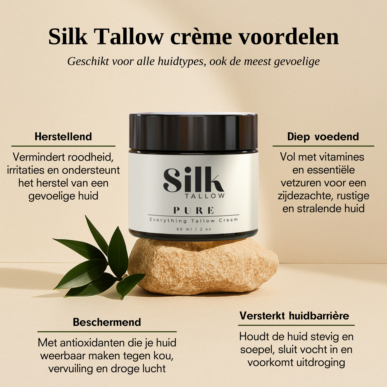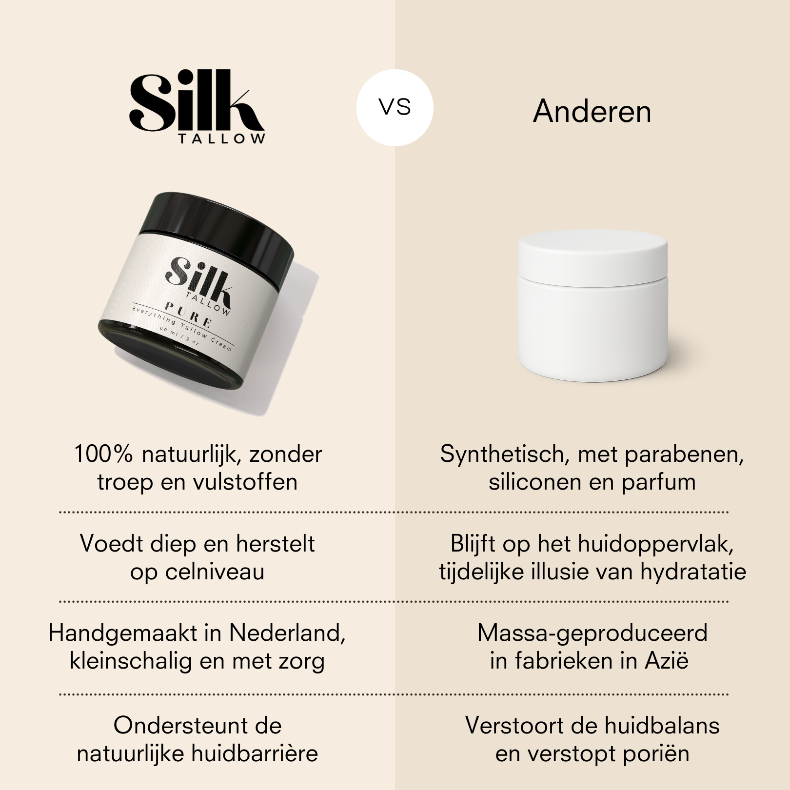 Ontdek de eenvoud van natuurlijke huidverzorging met Silk Tallow Pure, onze original whipped tallow crème. Deze ongeparfumeerde, rijke crème die speciaal ontwikkeld om jouw huid te voeden en te beschermen. Silk Tallow Pure is perfect voor mensen die een minimalistische, geurloze formule zoeken die de huid verzorgd en kalmeert zonder irriterende ingrediënten. De luchtige whipped textuur smelt op de huid, trekt snel in en maak je huid zijdezacht.
